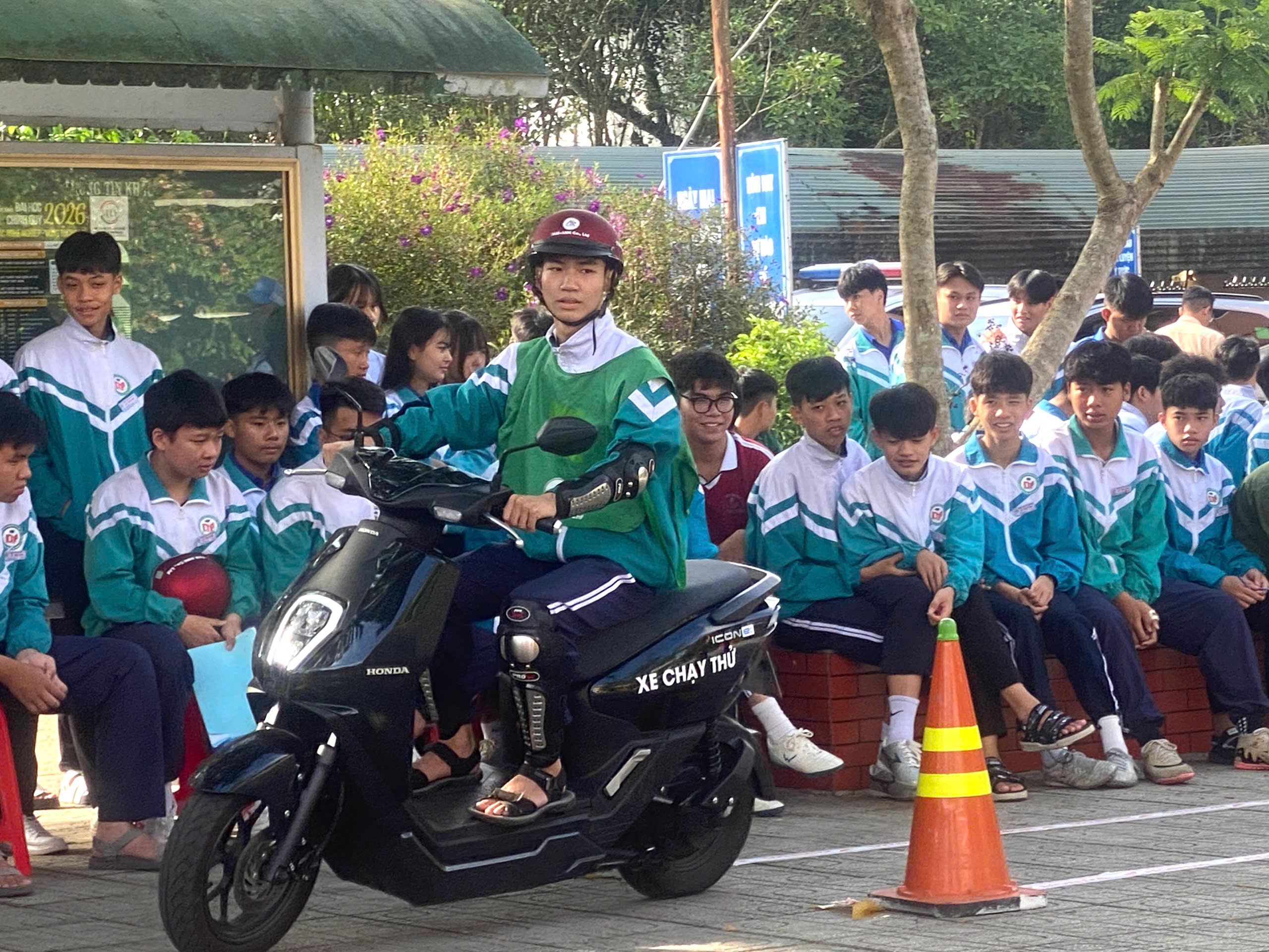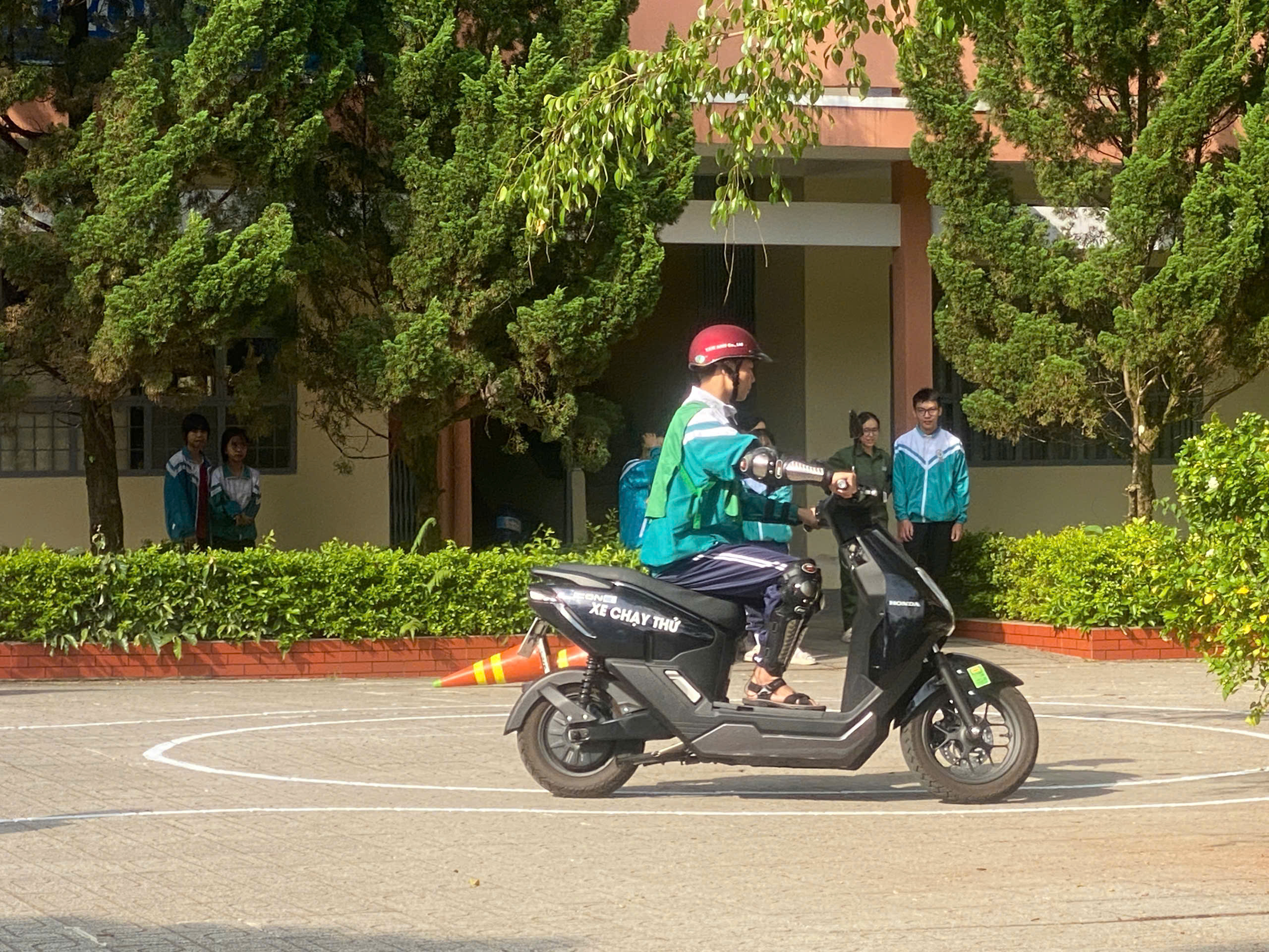 Đặc biệt, phần hướng dẫn kỹ năng lái xe an toàn do đại diện doanh nghiệp thực hiện đã thu hút sự quan tâm lớn của học sinh. Nội dung tập huấn tập trung vào kỹ năng điều khiển xe an toàn, cách xử lý các tình huống bất ngờ khi tham gia giao thông, tư thế lái xe đúng và các nguyên tắc đảm bảo an toàn khi sử dụng xe gắn máy, xe máy điện. Những kiến thức này không chỉ mang tính lý thuyết mà còn gắn với thực tiễn, giúp học sinh dễ dàng áp dụng trong cuộc sống hàng ngày.