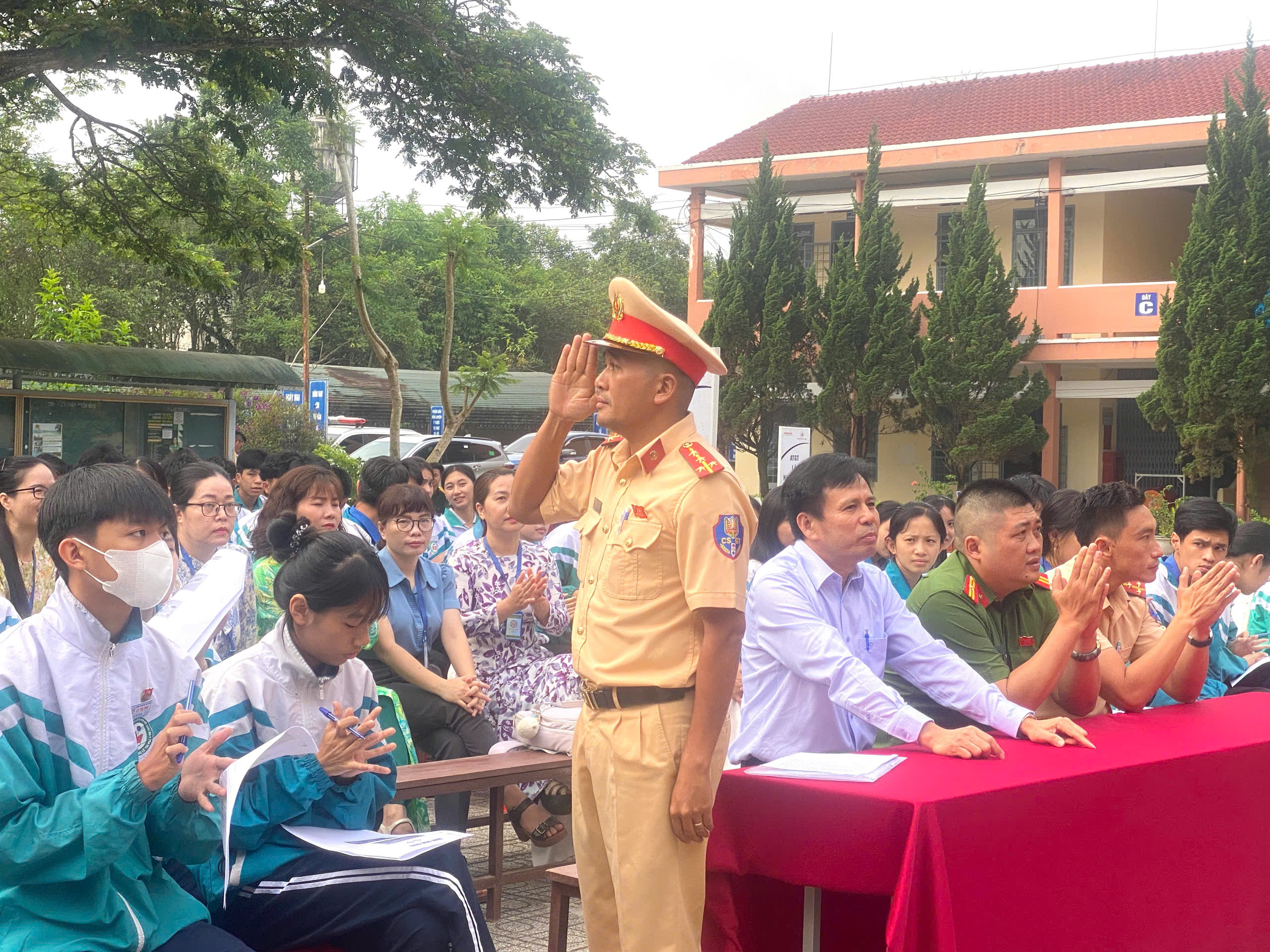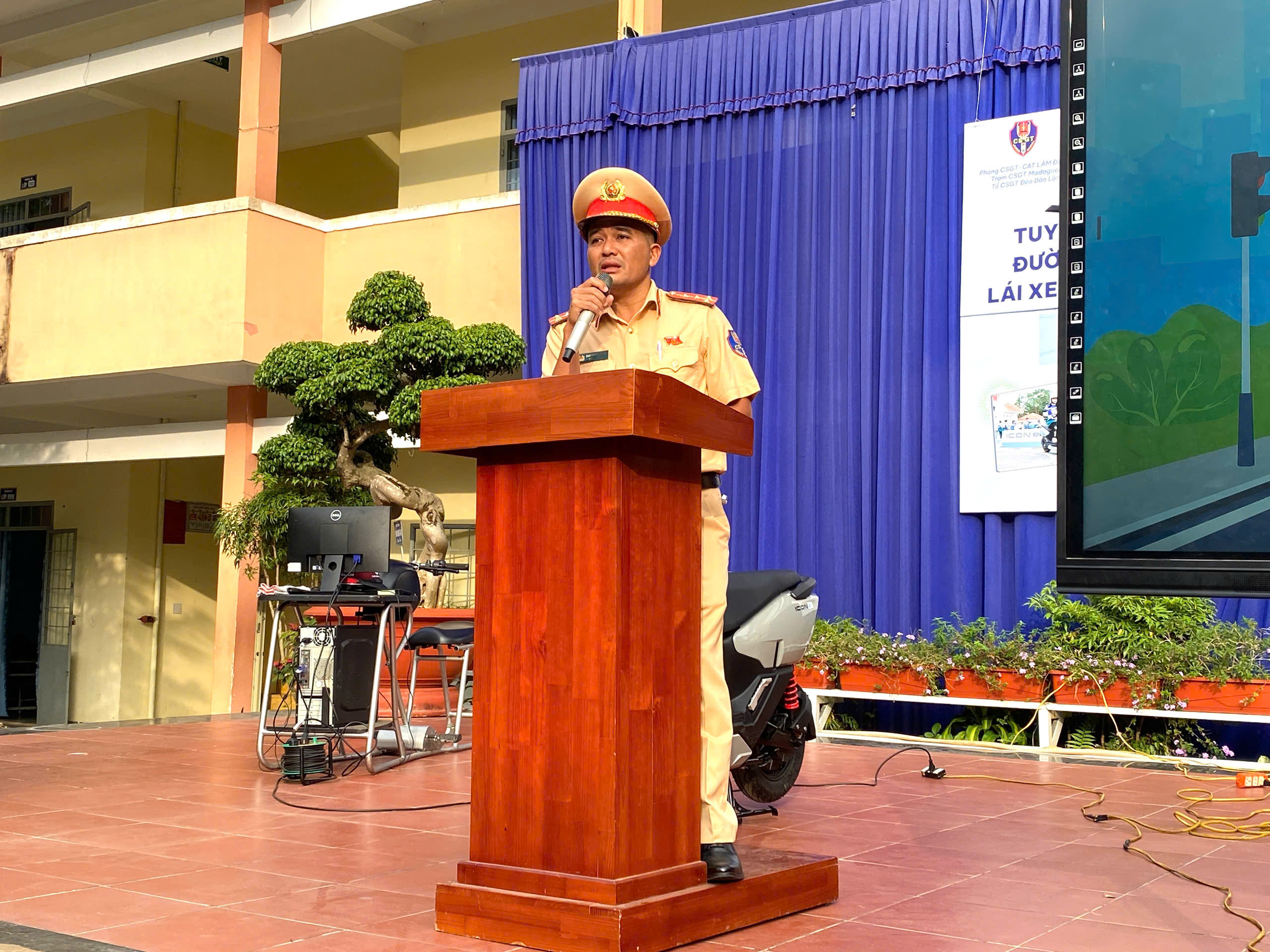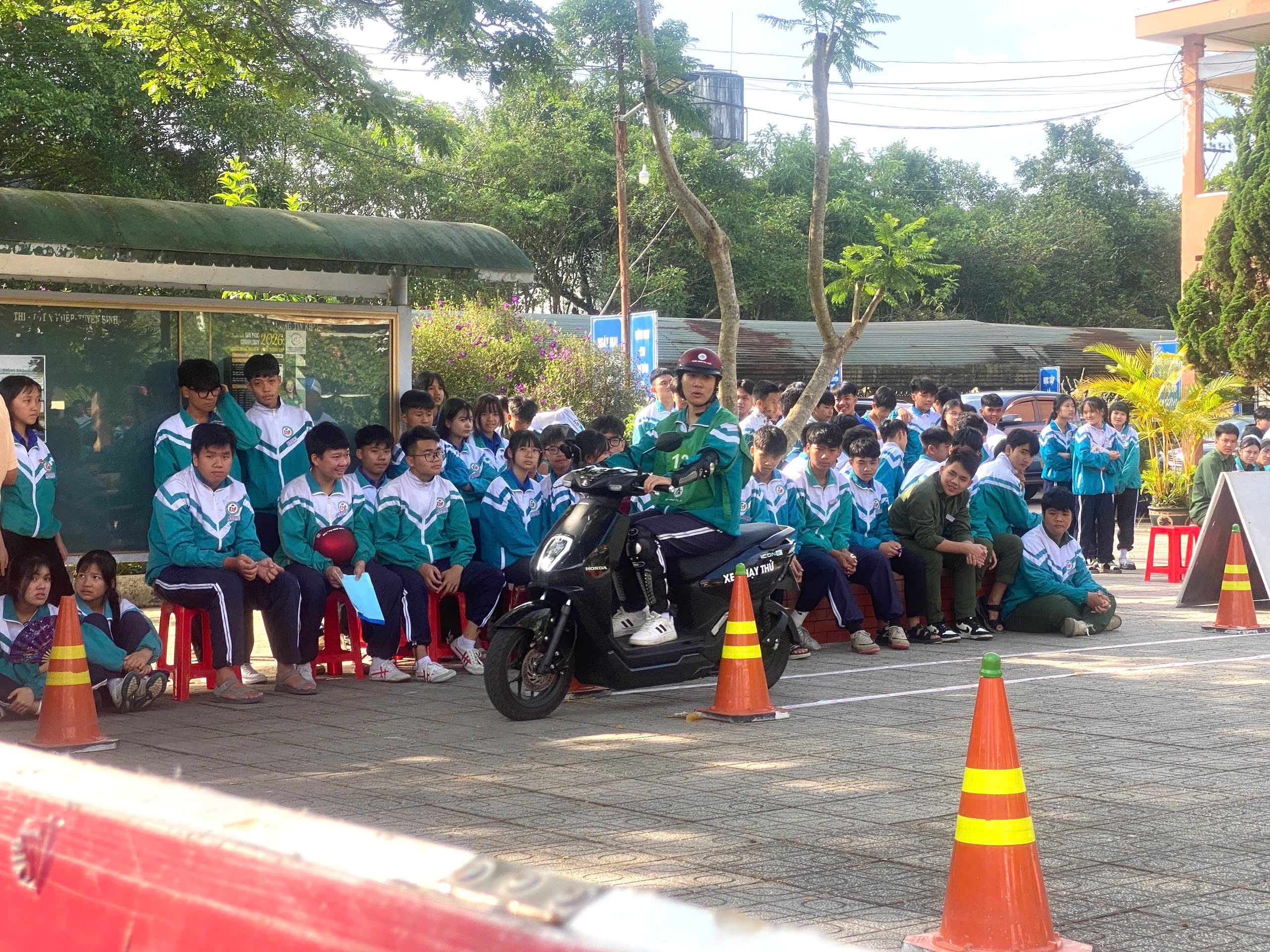 Tại buổi tuyên truyền, đại diện lực lượng Công an và Cảnh sát giao thông đã phổ biến những nội dung cơ bản, trọng tâm của Luật Trật tự, an toàn giao thông đường bộ. Các quy định liên quan trực tiếp đến học sinh như độ tuổi điều khiển phương tiện, quy định về đội mũ bảo hiểm, chấp hành tín hiệu đèn giao thông, tốc độ cho phép… được trình bày rõ ràng, dễ hiểu. Bên cạnh đó, các tình huống vi phạm thường gặp cũng được phân tích cụ thể, giúp học sinh nhận diện và phòng tránh.